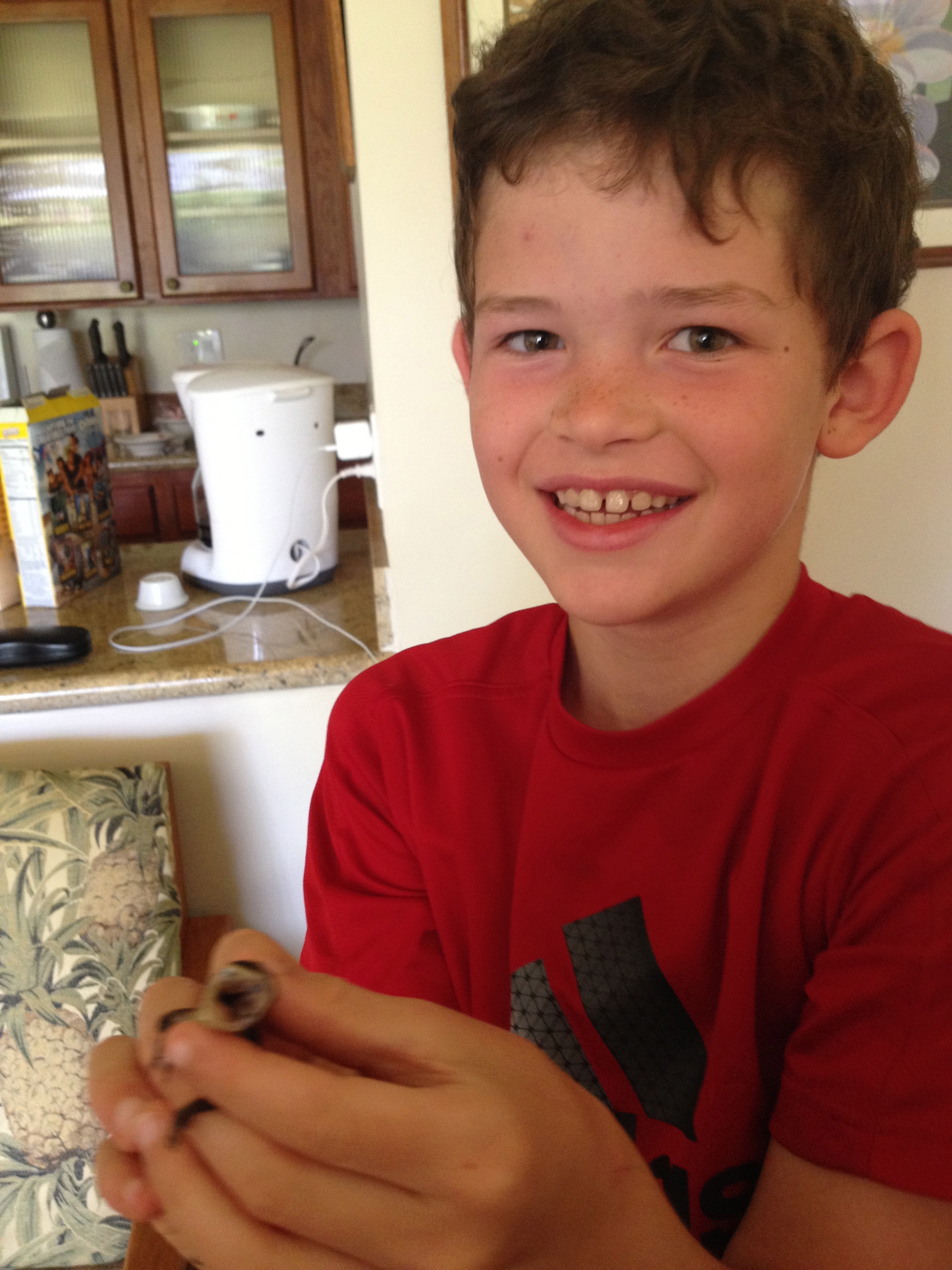 ‘R’ caught a gecko.  Poor guy is traumatized. (The gecko, not ‘R’…)